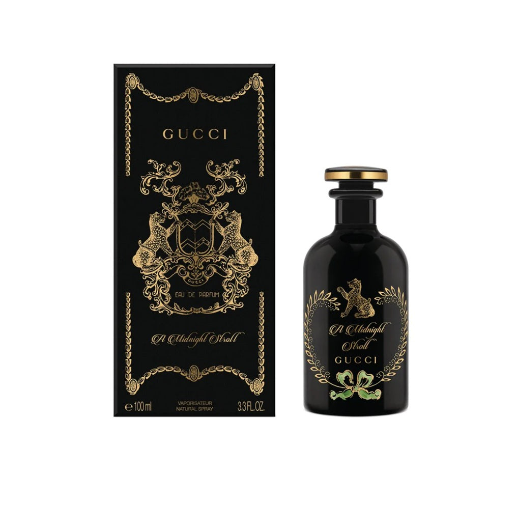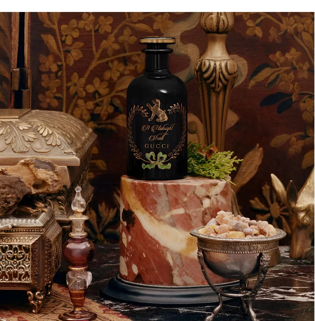 The Alchemist's Garden A Midnight Stroll Eau de Parfum by Gucci features an incense-scented fragrance celebrating the allure of the night. It evokes the aromatic profile of Incense and blends it with notes of smoky Cade Wood and fresh Cypress.